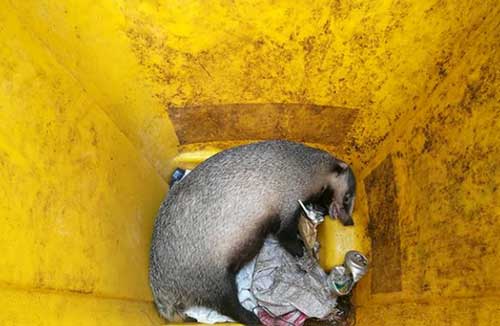 9月11日上午7點左右,南京鼓樓區建寧路200號附近一居民小區,保潔員周某報警,稱她在小區垃圾箱內發現一只疑似已懷孕的不知名野生動物,看上去很兇,現在被困桶內無法出來,報警求助,接警后民警隨后趕至現場。