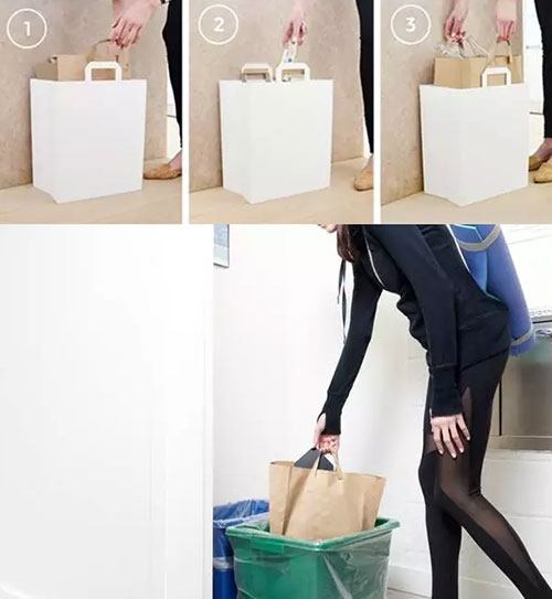 它的正確使用方式是搭配上購物紙袋,這一點和我們的習(xí)慣似乎不太一樣,也許是因為美國購物時使用紙袋更多,勤儉持家的家庭主婦們將這些紙袋用作垃圾袋,可是紙袋不夠牢固,放上東西便會東倒西歪,有這樣一個垃圾桶正好解決問題,其實它的外形也和購物紙袋有些相似呢。當(dāng)然,將紙袋換成我們習(xí)慣的塑料袋,照樣可以優(yōu)雅地裝垃圾。它有黑白兩色可選,放在辦公室、廚房均可。