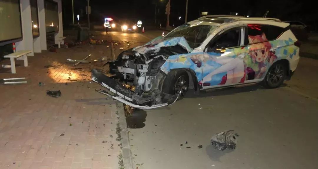 萬幸的是,車上的安全氣囊都及時打開了,盡管車上四人嚇得魂飛天外,但身體都沒啥大礙,只有司機(jī)譚某的左手有些輕微擦傷。陳警官趕到現(xiàn)場,只見一輛粵CT××33比亞迪小車打橫停靠路邊,臭烘烘的垃圾撒了一地,垃圾桶倒在一邊,交通指示牌和警示樁也被撞得連根拔起,情況比預(yù)想的要嚴(yán)重得多。陳警官發(fā)現(xiàn),小車車前蓋和兩側(cè)車身貼滿了動漫美少女貼膜,但由于撞擊,原本萌萌的美少女此時變得有些猙獰。