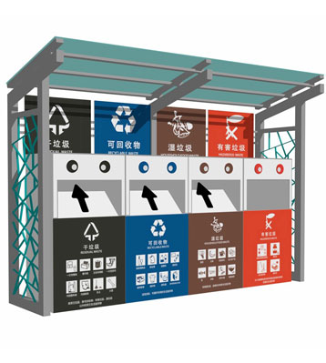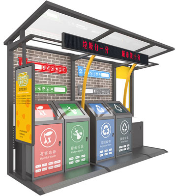 設有擋雨棚,可配備垃圾箱信息顯示屏、防水照明燈、廣告屏,進行地面硬化。對社區玻金塑紙可回收物,其他垃圾,廚余垃圾,有害垃圾等生活垃圾定時定點投放收集.