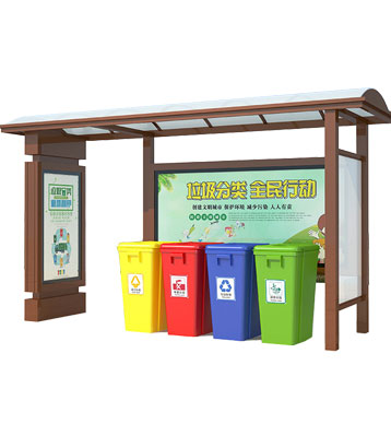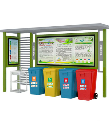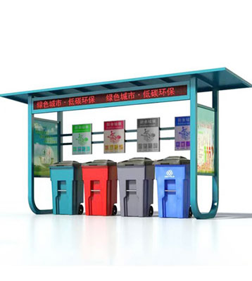 設有擋雨棚,可配備垃圾箱信息顯示屏、防水照明燈、廣告屏,進行地面硬化。對社區(qū)玻金塑紙可回收物,其他垃圾,廚余垃圾,有害垃圾等生活垃圾定時定點投放收集.